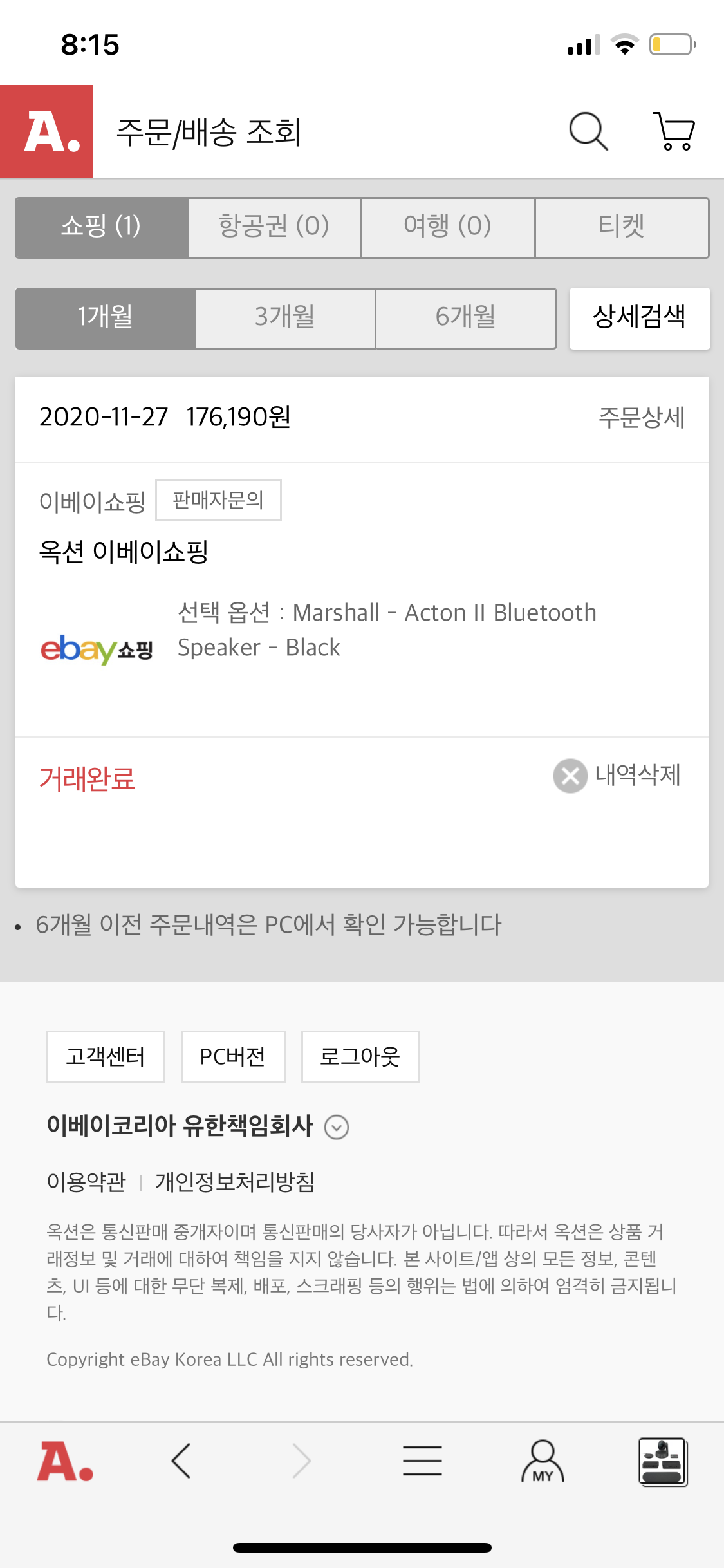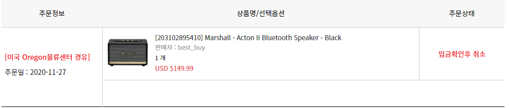 옥션이베이에서 마샬 액톤2 구매한 금액이랑 같아서 확인해보니까 모바일로는 안뜨는데 웹으로 '주문배송조회'들어가니까 주문상태에 '입금확인후 취소'라고 나와있다. 취소된거겠지,.,,,,? 혹시 몰라서 1:1 문의로 남겨 놓긴함.