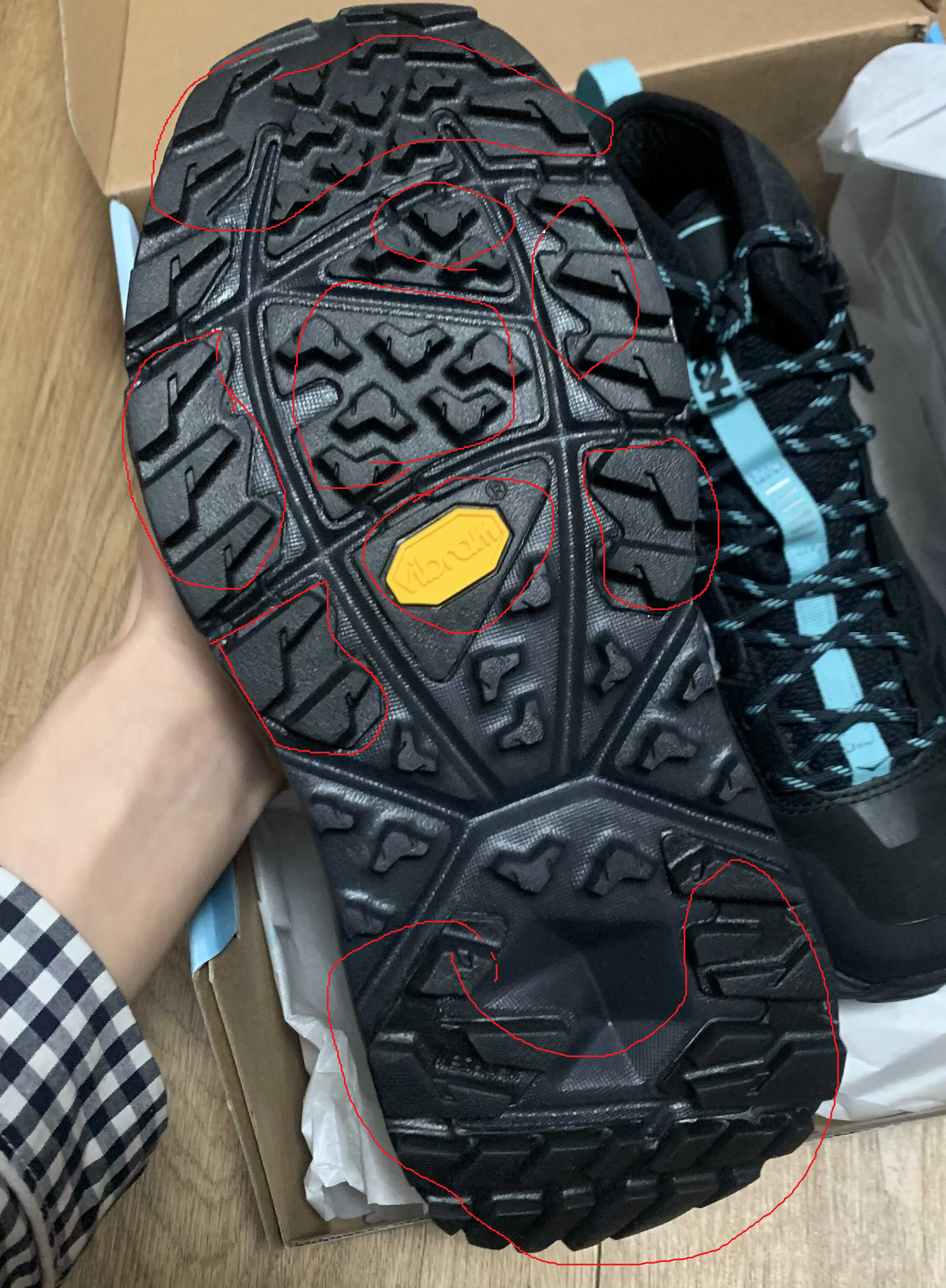 아, 참고로 카하가 내구성이 별로라는 말이 많은데, 내구성 이슈로 단종을 시킨게 아닌가 싶다. 오른쪽 사진에 빨간색으로 표기한 곳 보면 저게 비브람 메가그립 밑창인데, 저렇게 조각조각으로 붙여놔서 그런가 잘 떨어지고 내구성이 별로인가봄. 그래서 그런가 이번에 새로 나온 텐나인은 밑창이 크게 두개라고 그랬었나? 암튼 그런 내구성 문제를 좀 보안한듯.