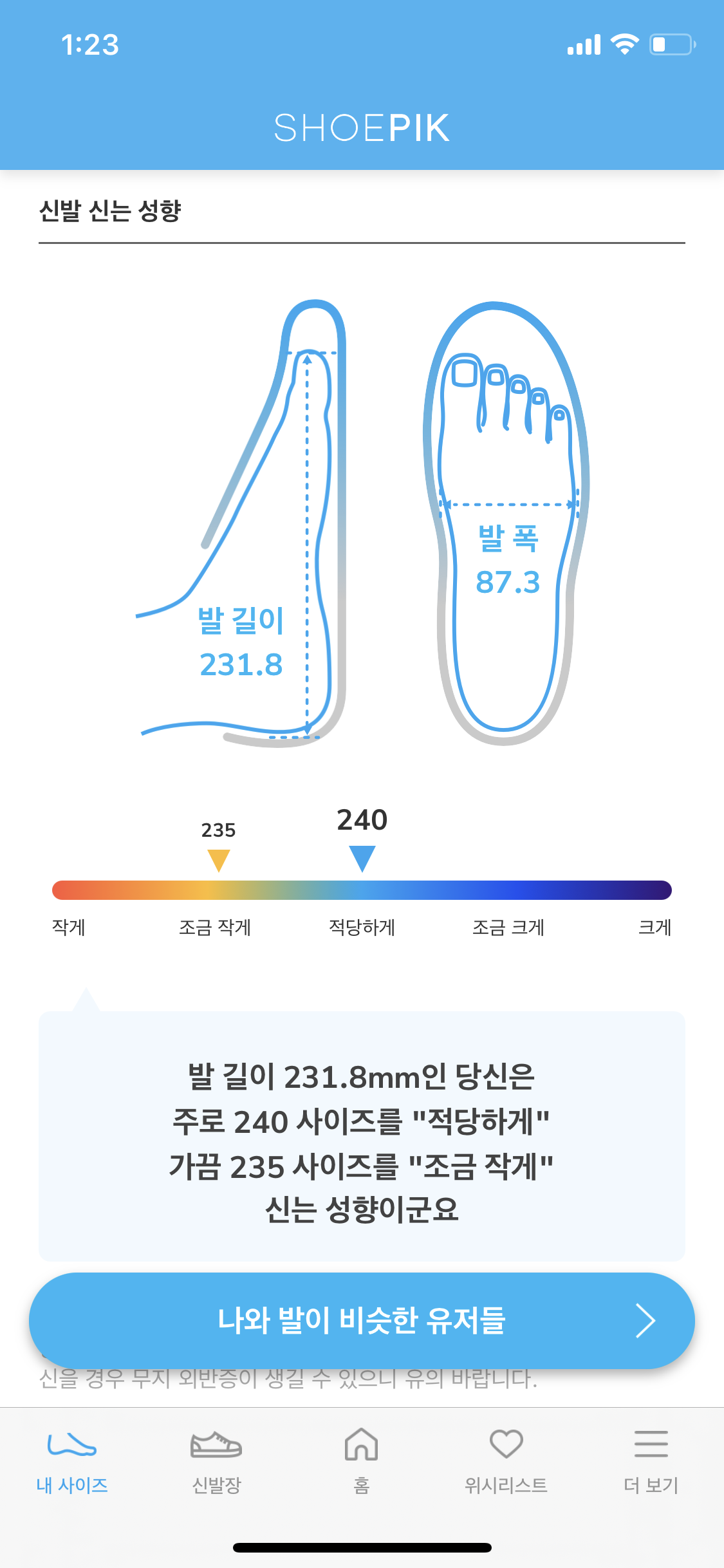 그때 사이즈로 엄청 고민 했어가지고 검색하다가 알아낸 SHOEPIK이라는 어플! A4용지 끝에 내 발 맞추고 찍으면 내 발 폭이랑 발 길이 계산해서 나온다. 많이 찍어 볼수록 정확하겠지만 난 귀찮지만 3번이나 찍어봄. 난 내가 발에 살이 없어서 칼볼인줄 알았는데 뼈땜에 걍 평균적인 발폭은 가지고 있었음.