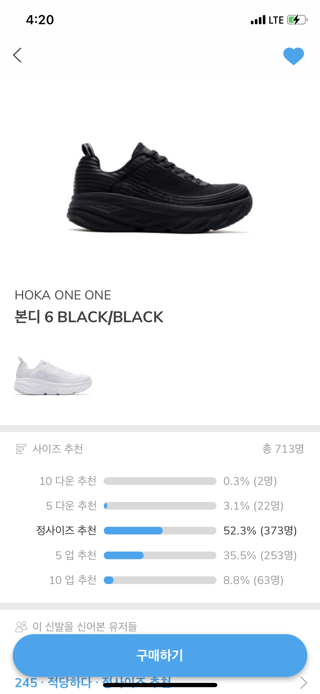 어플에서 본디6를 검색하면 실구매 사람들이 뭔 사이즈 추천 해주는지 나오는데 대부분 정사이즈 추천해주길래 나도 와이드 말고 레귤러 정사이즈(235)로 ㄱㄱ함.
