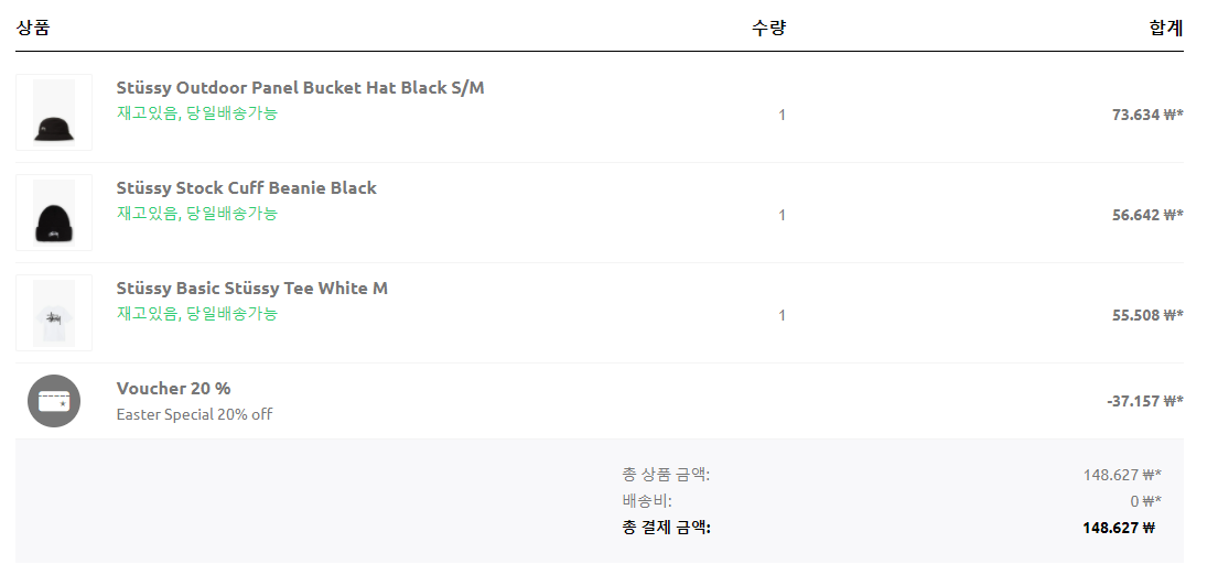 어제 저녁-오늘까지 컬티즘에서 스투시 제품 보고 있었는데, 갑자기 컬티즘 홈에 이스터 할인 20%코드가 떴길래 걍 질렀다.