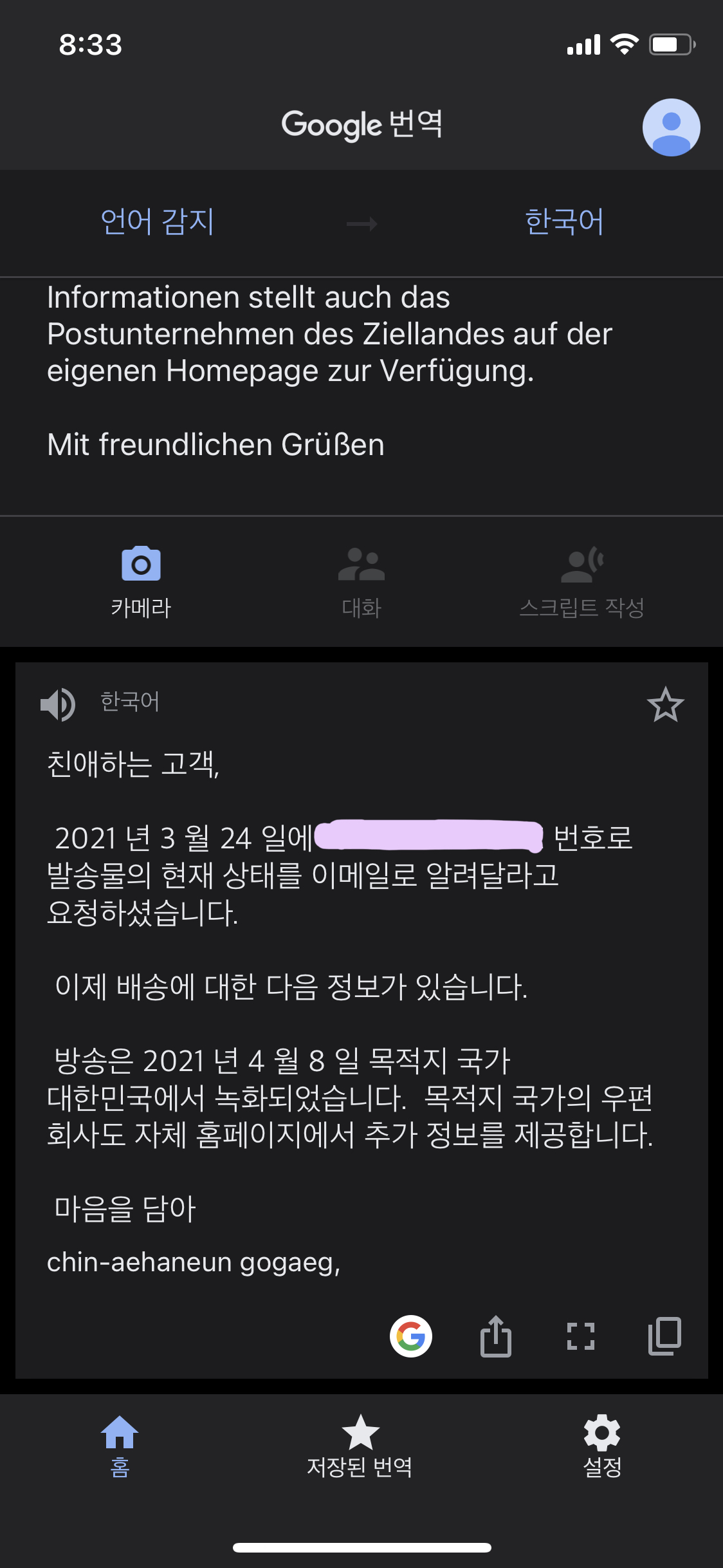 찾아 보니까 늦게 받는 사람은 좀 늦게 받고 빨리 받는 사람들은 2주만에 받기도 하던데, 난 2주만에 한국 도착함. 한국 도착하며 이제 일주일 안에는 도착하겠지 하는 희망회로 돌리는 중.