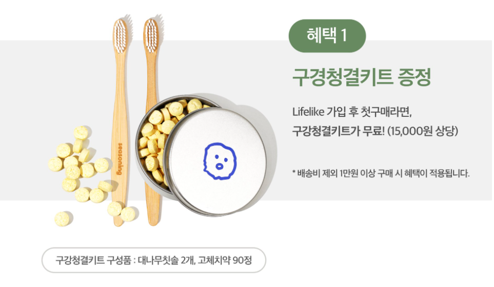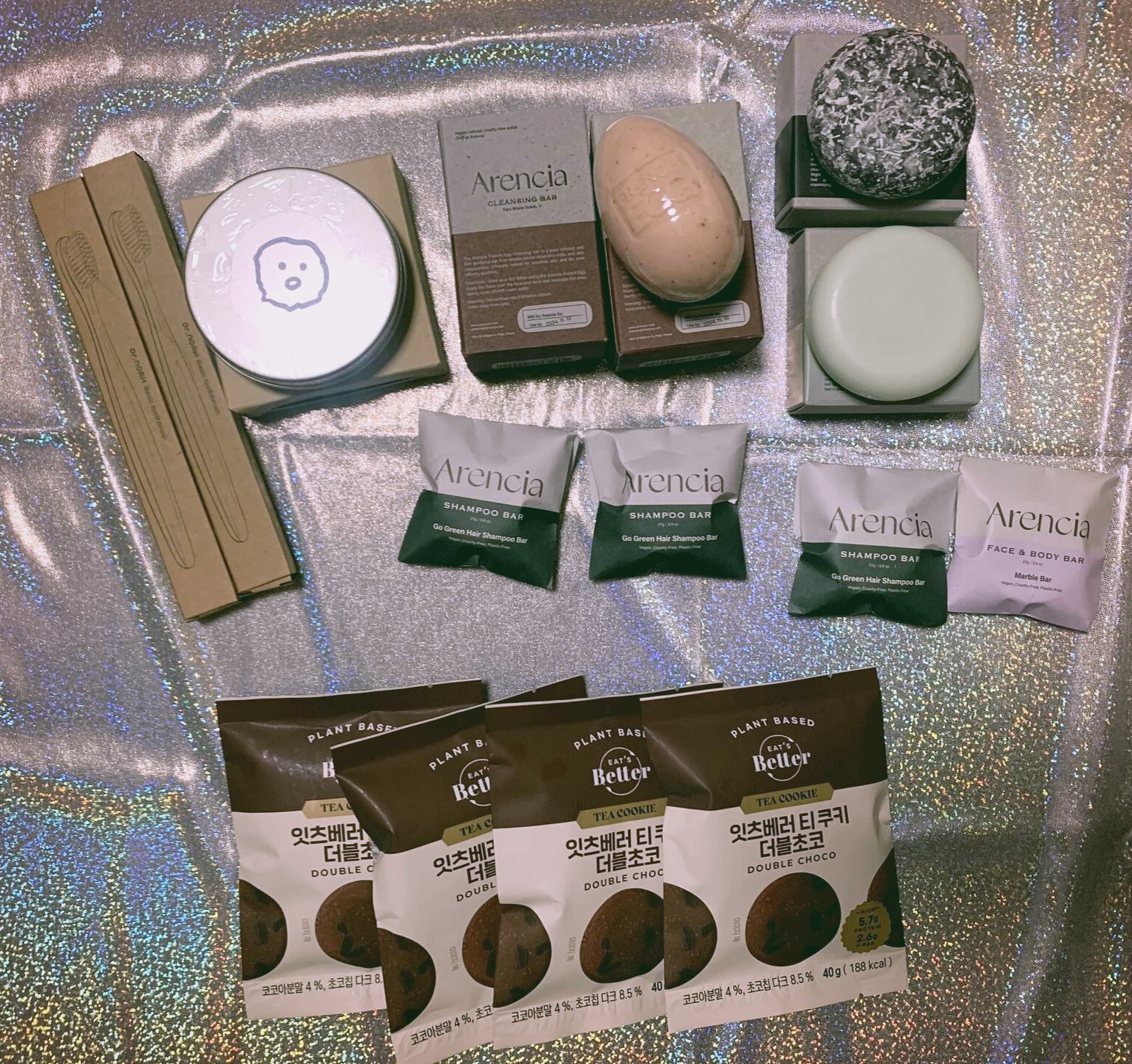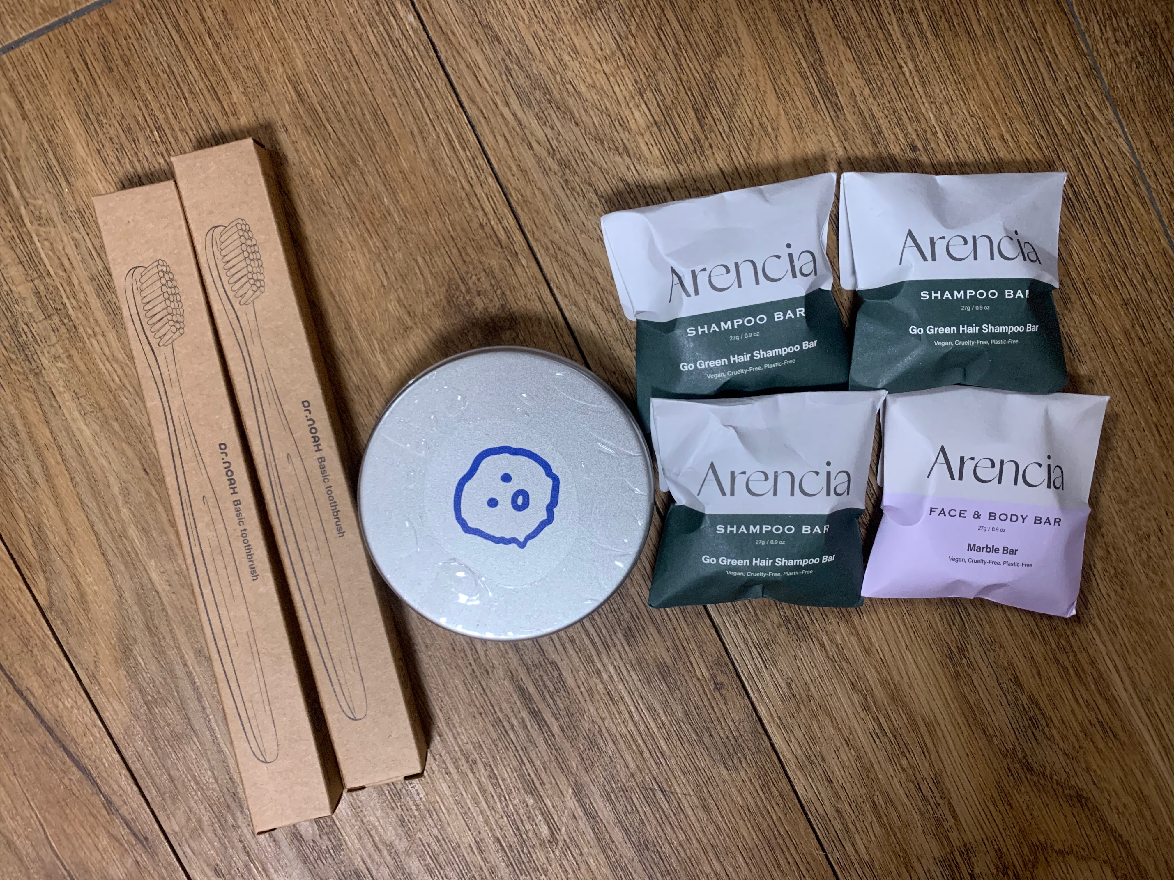 대나무칫솔2개랑 틴케이스안에 들어있는 고체치약은 라이프라이크에서 첫구매 사은품으로 받은거고 , 조그만한 아렌시아 샴푸파 샘플 3개 뷰티바1개는 지금 구매 선착순 이벤트로 증정중이라서 받았다! 개굳!