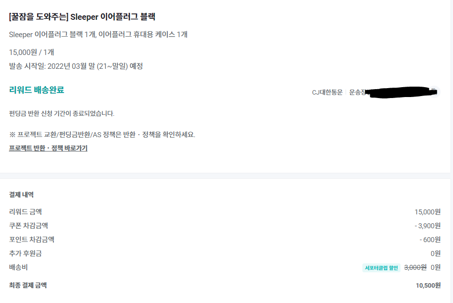 강아지 때문에 내 방 문을 닫지는 못하고 주말에 거실에서 엄빠 떠드는 소리 때문에 늦잠을 잘 수가 없어서 충동적으로 와디즈에서 쿠폰먹이고 10,500원 주고 산 이어플러그.