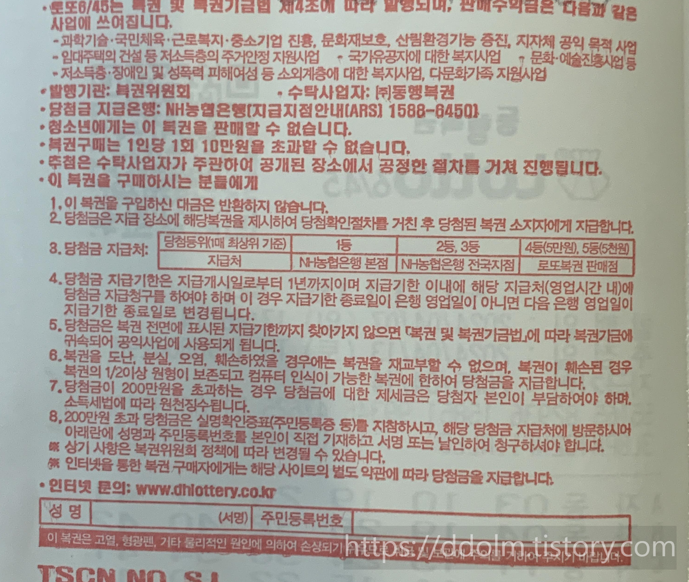 아 당첨복권 낼때 종이 뒤에 이름/서명/주민등록번호 적어 달라고 해서 적어서 냄.