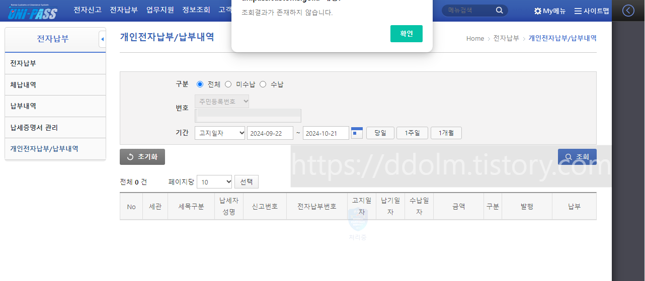 회원가입하고 조회해보니 내야될 관세 있다고 나옴! 마참내! 관세 낼 수 있다!~!