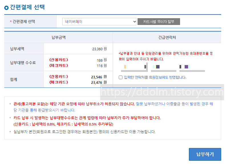 3. 주민등록번호로 조회하면 납부해야될 내역이 나옴. 그거 누르고 결제 하면 끝!